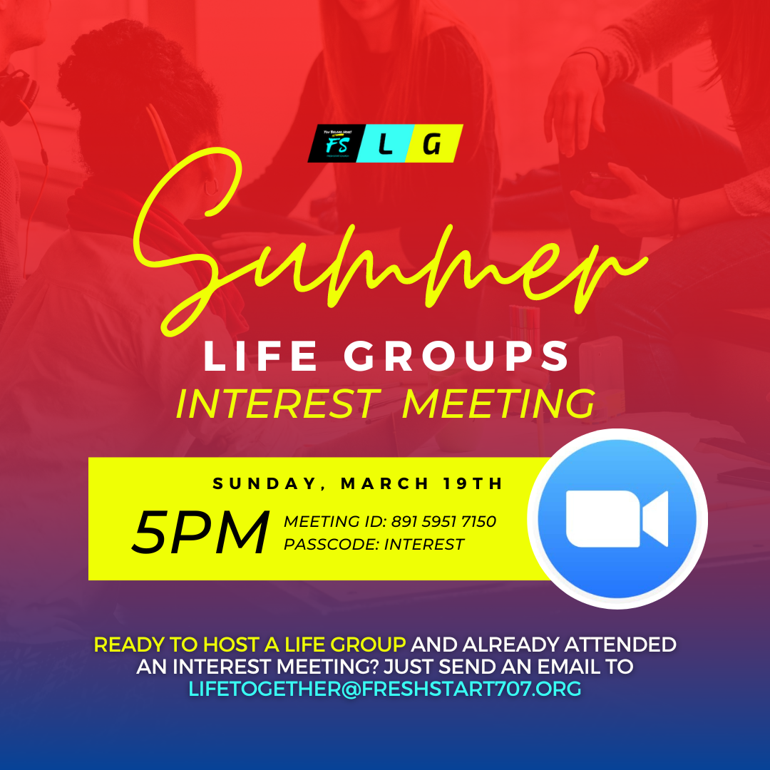 Life Group Interest Meeting Sunday, March 19, 2023 5:00 PM 6:00 PM Google Calendar ICS Join this amazing meeting to hear how YOU can be the next LIfe Group Facilitator. You’ll get all the details and hear how things work together to provide life giving groups for members to connect. Join Zoom MeetingMeeting ID: 880 8973 8061 Passcode: 712592